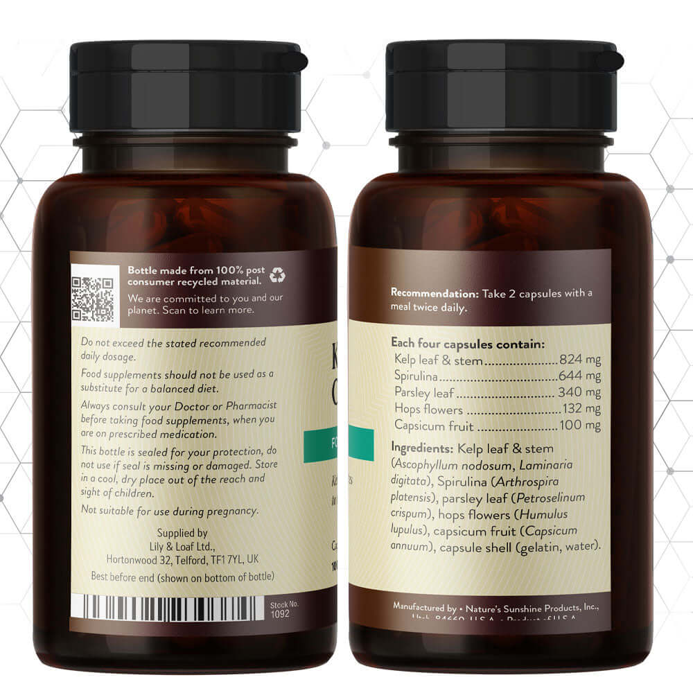 Kelp leaf & stem (Ascophyllum nodosum, Laminaria digitata), Irish moss algae (Chondrus crispus), capsule shell (gelatin, water), parsley leaf (Petroselinum crispum), hops flowers (Humulus lupulus), capsicum fruit (Capsicum annuum).