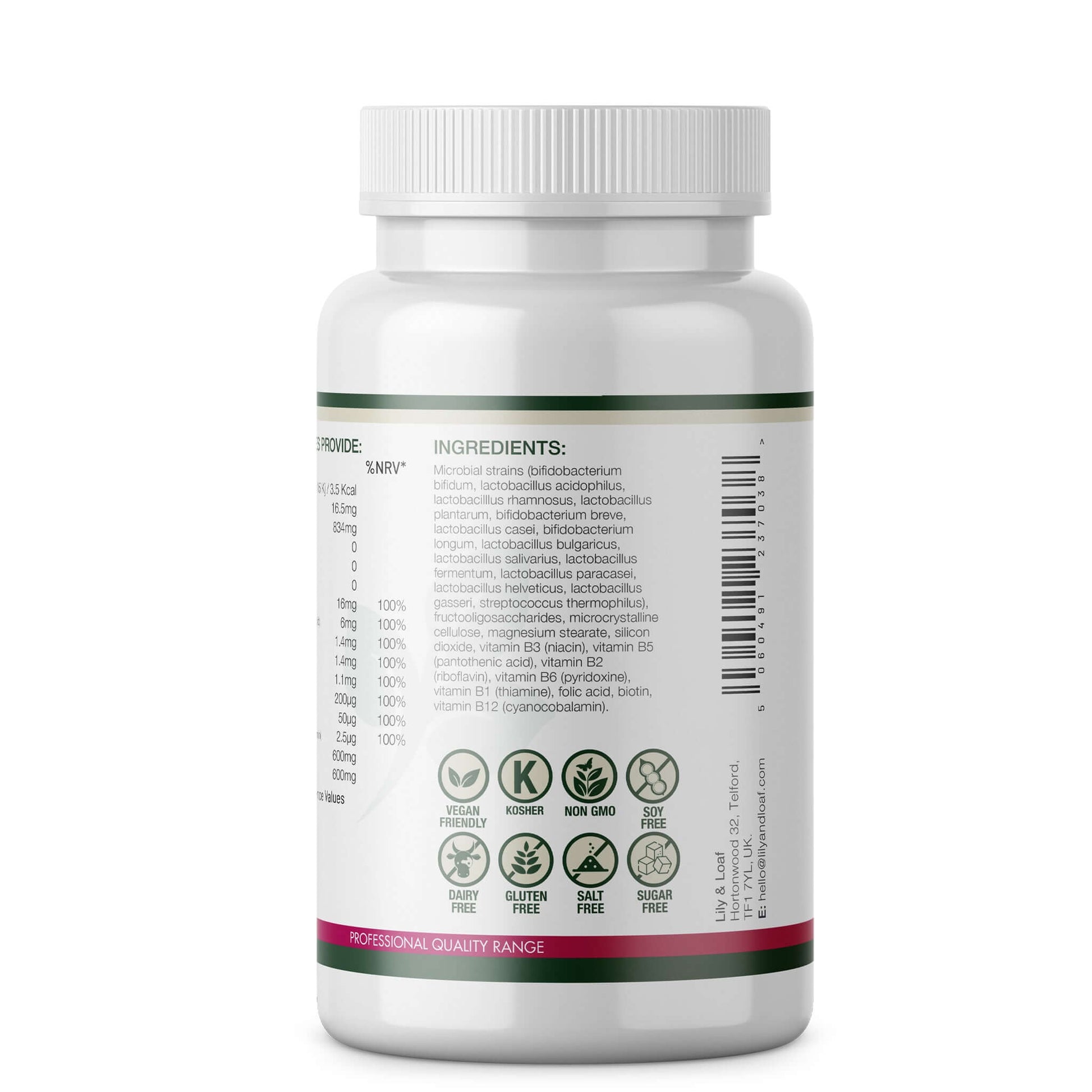 • Daily Flora – Multi-strain microbial blend, FOS, B-vitamin complex, vegan capsule shell.
